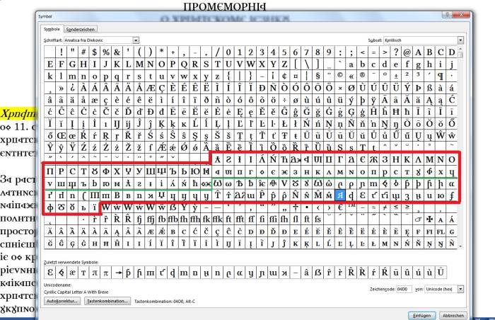 Selection of additional graphemes for the Croatian Cyrillic alphabet in the font »Arvatica fra Divković«: